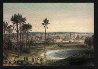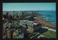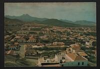 Tarjeta Postal con una vista aérea de una parte de la ciudad de Mindelo en Cabo Verde. En el reverso de la postal aparece un mensaje en español de Besseguito para Norma Soto.
