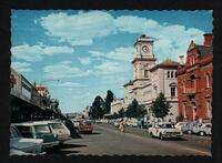 Tarjeta Postal con la imagen de la calle Auburn y la oficina de correos en Goulburn, Australia. En el reverso de la postal aparece una dedicatoria en inglés para Diana Dean de Ellis, dos cuños y un sello postal prácticamente rasgado.