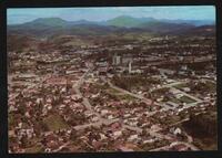 Tarjeta Postal con vista aérea de la ciudad de Brusque en Brasil. Fotografía de Nelson R. Silva. En el reverso de la postal aparecen unos sellos y una firma.