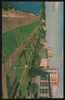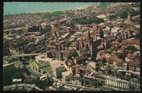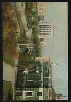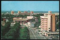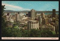 Tarjeta Postal con vista panorámica de la ciudad desde el Monte Royal en Montreal, Québec. Canadá. Foto: E. Otto. En dicha imagen se pueden observar los rascacielos y demás edificaciones, un lago, un puente y árboles.