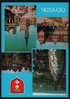 Tarjeta Postal con varias vistas de la ciudad de Gdansk en Polonia. En el anverso de la postal se muestra el nombre de la ciudad y su escudo y las imágenes de la Calle Dluga, Casas cerca de un mercado, la edificación Brama Zielona y el Ayuntamiento.