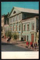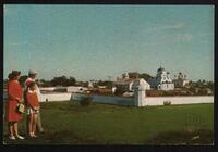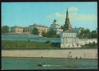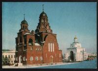 Tarjeta Postal con imagen de dos edificios representativos de la ciudad rusa de Vladimir, Trinity Church Museum y Golden gate de Vladimir Kozlov, ubicados en la calle Moskovskaya.