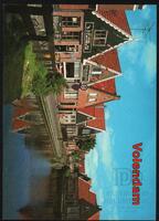 Tarjeta Postal con una vista de las casas típicas frente a un lago de la ciudad de Volendam en los Países Bajos. En el anverso de la postal y en letras rojas se muestra el nombre de la ciudad y en el reverso aparece un mapa del país.