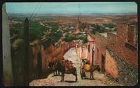 Tarjeta Postal con vista parcial de la ciudad de Toluca en México. En el reverso de la postal aparece un mensaje en español para Wilfred y un mapa del país.