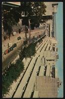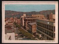 Tarjeta Postal con vista aérea de una avenida en la ciudad de Bucaramanga perteneciente a Santander en Colombia. En la misma se pueden observar los diversos edificios, carteles de propaganda, una avenida, medios de transporte y en último plano las montañas.