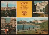 Tarjeta Postal con varias vistas de la ciudad de Minsk, capital de la Bielorrusia Soviética. En el anverso de la postal aparecen los siguientes lugares: La plaza de la Victoria, el Teatro de Ópera y Ballet, La plaza de la estación y tramo del río Svisloch, además del nombre de la ciudad y el escudo de la misma y al dorso de muestra el logo de la editorial.