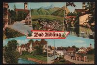 Tarjeta Postal con la imagen de la ciudad de Bad Aibling en Baviera, Alemania. En el anverso aparecen diversos lugares de la ciudad y el nombre de la misma. En el reverso de la postal se muestra un sello postal, un cuño y una dedicatoria.