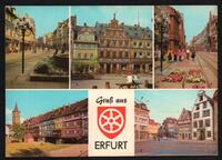 Tarjeta Postal con imágenes de la ciudad de Erfurt en Turingia, Alemania. En el anverso de la postal aparecen varios lugares y en el centro dice: Saludos desde Erfurt.