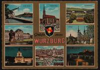 Tarjeta Postal con imágenes de Würzburg, ciudad ubicada en Baviera, Alemania. En el anverso de la postal aparecen las palabras "Grüße aus Würzburg" (Saludos de Würzburg) y los siguientes lugares: Hotel Alter Kranen, Marienkapelle (Iglesia Católica romana), Hauptbahnhof (Estación de ferrocarril), Residenz (Residencia Würzburg), Killiansbrunnen (Fuente con la figura en bronce de Saint Killian), Alte Mainbrücke (Puente de piedra para peatones), Festing Marienberg (Fortaleza) y Kappele (Santuario). En el reverso se encuentra un sello de la ciudad con las siguientes palabras: Festung Marienberg. Würzburg.