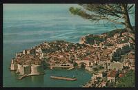 Tarjeta Postal con vista panorámica de la ciudad de Dubrovnik en Croacia. Impreso en Estados Unidos. En la parte trasera de la postal aparece el logo de una aerolínea americana.