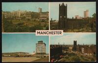 Tarjeta Postal con varias vistas de la ciudad de Manchester en Gran Bretaña. Se visualizan el Piccadilly Gardens, The Cathedral, the airport, Deansgate and the Cathedral. En el anverso de la postal aparece el nombre de la ciudad.