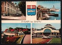 Tarjeta Postal con varias vistas de la ciudad de Evian les Bains en Thonon les Bains, Francia. Se muestran el nombre de la ciudad y el escudo de la misma, el Evian Casino, el puerto y el Establecimiento Termal.