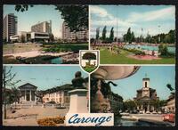 Tarjeta Postal con imágenes de la ciudad de Carouge en Ginebra, Suiza. En el anverso de la tarjeta aparecen cuatro lugares distintos, el nombre de la ciudad y en el centro el escudo. En el reverso de la misma se muestra el logo de la editorial.