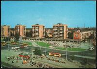 Tarjeta Postal con vista de la ciudad de Tirgoviste en Rumanía. Foto: M. Andreescu. Arta Grafica. En el reverso de la postal aparece una dirección escrita con bolígrafo azul.