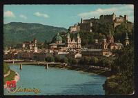 Tarjeta Postal con la imagen de la ciudad de Salzburg, Austria. En el anverso de la postal se muestra el nombre de la ciudad y su escudo y en el reverso aparece una cita de Alexander Von Humbolt.