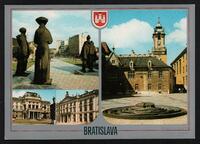 Tarjeta Postal con imágenes de la ciudad de Bratislava en Eslovaquia. En el anverso de la postal aparecen el nombre de la ciudad y su escudo además de cuatro lugares icónicos; las estatuas de la Plaza del Levantamiento Nacional Eslovaco (SNP, siglas en eslovaco), la Plaza de los Primates y el antiguo Ayuntamiento de Bratislava, el Teatro Nacional Eslovaco y el Palacio de los Primates. Fotos de Frantisek Vrbovský.