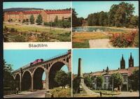 Tarjeta Postal con imágenes de la ciudad de Stadtilm en Turingia, Alemania. Bild und Heimat. Color de la foto: Hildebrandt, Erfurt. En el anverso de la postal se muestra el Distrito Oberilm, una piscina, un viaducto y un mercado. En el reverso aparece un mensaje en español.