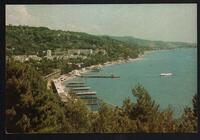 Tarjeta Postal con vista panorámica de la ciudad-balneario Sochi en Rusia, el mayor balneario en el Mar Negro. En la parte trasera de la postal aparece el logo de la editorial.