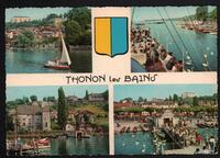 Tarjeta Postal con varias vistas de la ciudad de Thonon les Bains en Auvernia-Ródano-Alpes, Francia. Se observan en las cuatro imágenes del Lago Lémac, personas en las embarcaciones y en el muelle, cisnes, el nombre de la ciudad y su escudo.