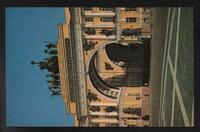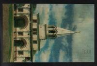 Tarjeta Postal con imagen del Arco de Triunfo del edificio del Estado Mayor en Leningrado (actual San Petersburgo). Arquitecto: C. Rossi. Se aprecian las esculturas en lo alto del arco y el tallado en piedra, el alumbrado público, señales de tránsito y personas.
