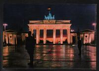 Tarjeta Postal con la imagen de la Puerta de Brandeburgo durante la noche en Berlín, Alemania. Se evidencian las edificaciones iluminadas y dos oficiales de guardia.