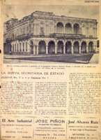 fotografía de la mansión ubicada en Cárcel entre Habana y Aguiar. Detrás hay una hoja con bosquejos de rejas coloniales. Anuncios de ornamentación, plomería y materiales.