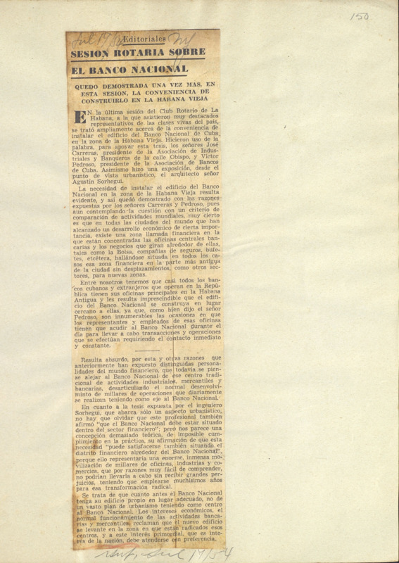 Editoriales : Sesión rotaria sobre el Banco Nacional : quedó demostrada una vez más en esta sesión la conveniencia de construírlo en La Habana Vieja