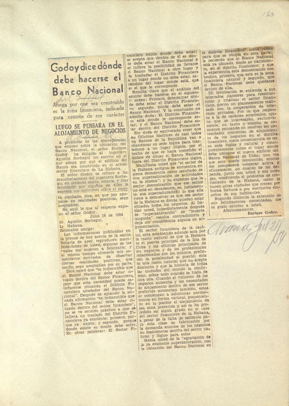 Godoy dice dónde debe hacerse el Banco Nacional : aboga porque sea construído en la zona financiera, indicada para centros de este carácter Luego se pensará en el alojamiento de negocios