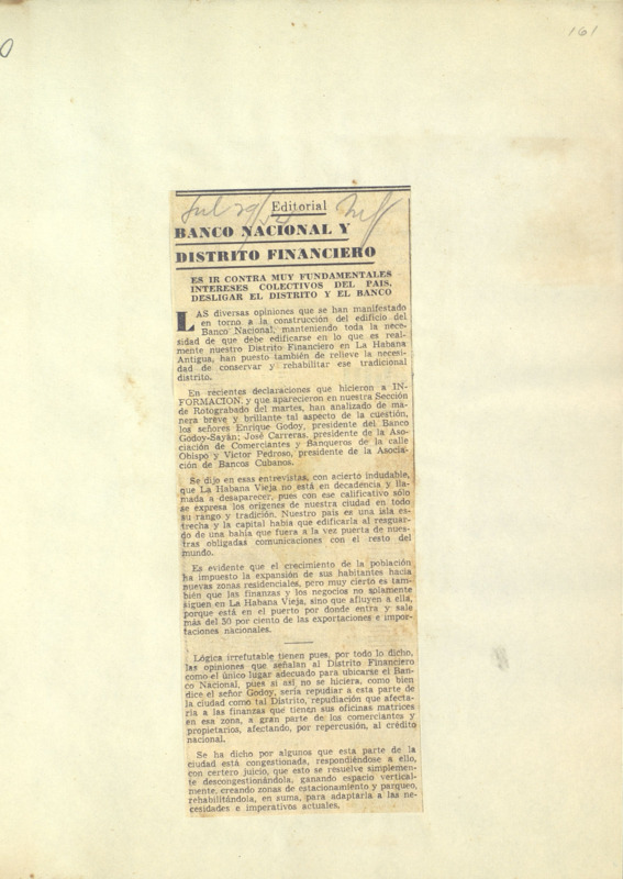 Editorial : Banco Nacional y distrito financiero : es ir contra muy fundamentales intereses colectivos del país desligar el distrito y el Banco