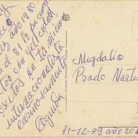 Tarjeta Postal con imagen de unas flores azules. En el reverso se muestra un mensaje manuscrito de felicitación de Agueda para Migdalia Prado Martínez y el logo de la editorial.