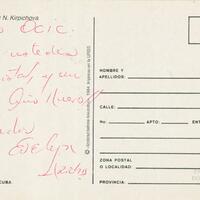 Tarjeta Postal con dibujo de unas flores rosadas. En el anverso de la postal aparece la palabra Felicidades y en el reverso se aprecia un mensaje manuscrito de Evelyn Archid para el Departamento Ocic.