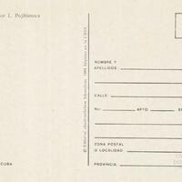 Tarjeta Postal con dibujo de unas flores azules. En el anverso de la postal aparece la palabra Felicidades.