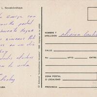 Tarjeta Postal con unas flores y mariposas como dibujo. En el anverso de la postal aparecen las palabras 8 de marzo y en el reverso se muestra un mensaje manuscrito de Mechy para Miriam Gutiérrez.