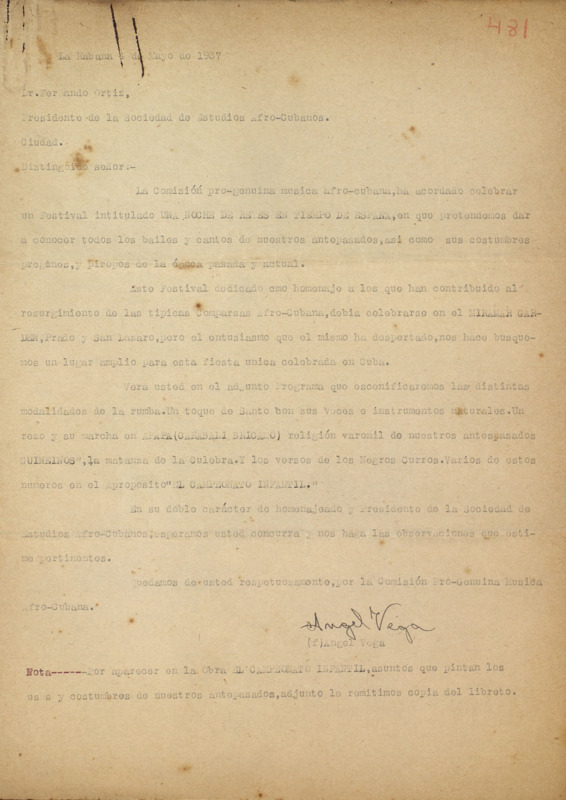 [Carta de Ángel Vega a Fernando Ortiz con motivo de la celebración de un festival sobre cantos, baile, piropos etc de tiempos pasados]