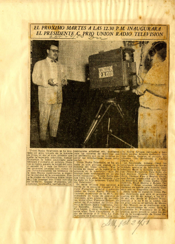 El próximo martes a las 12:30 pm inaugurará el presidente Carlos Prío Unión radio Televisión