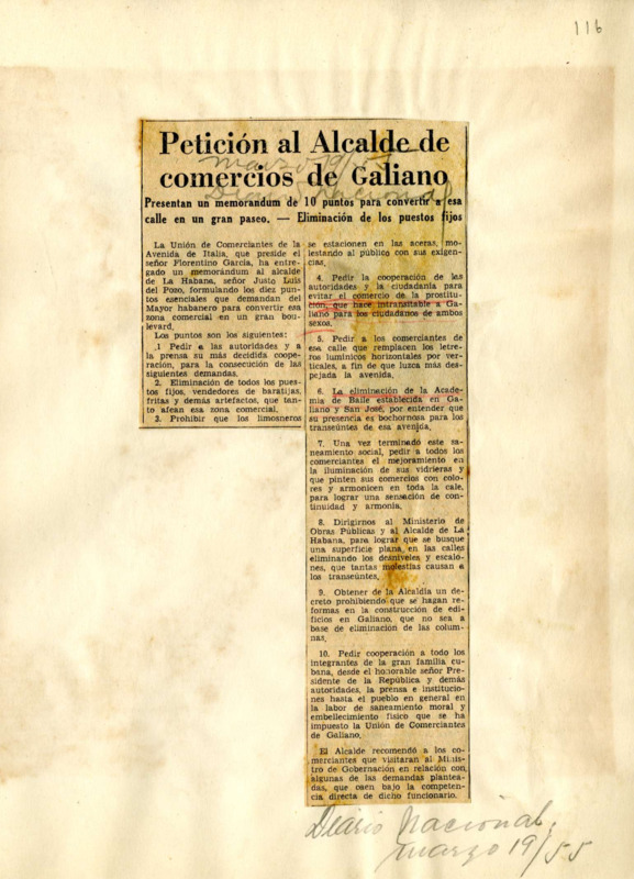Petición al alcalde de comercios de La Habana : presentan un memorandum de 10 puntos para convertir a esa calle en un gran paseo : eliminación de los puestos fijos