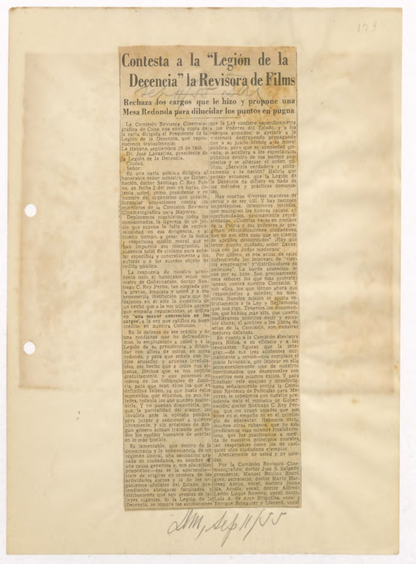 Contesta a la "Legión de la Decencia" la revisora de filmes : rechaza los cargos que le hizo y propone uan mesa redonda para dilucidar los puntos en pugna