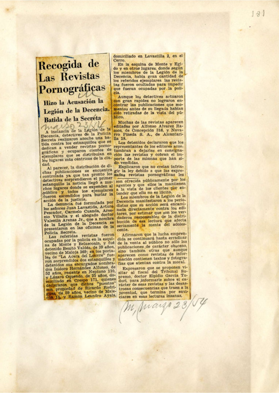 Recogida de las revistas pornográficas : hizo la acusación la Legión de la Decencia : batida de la Secreta