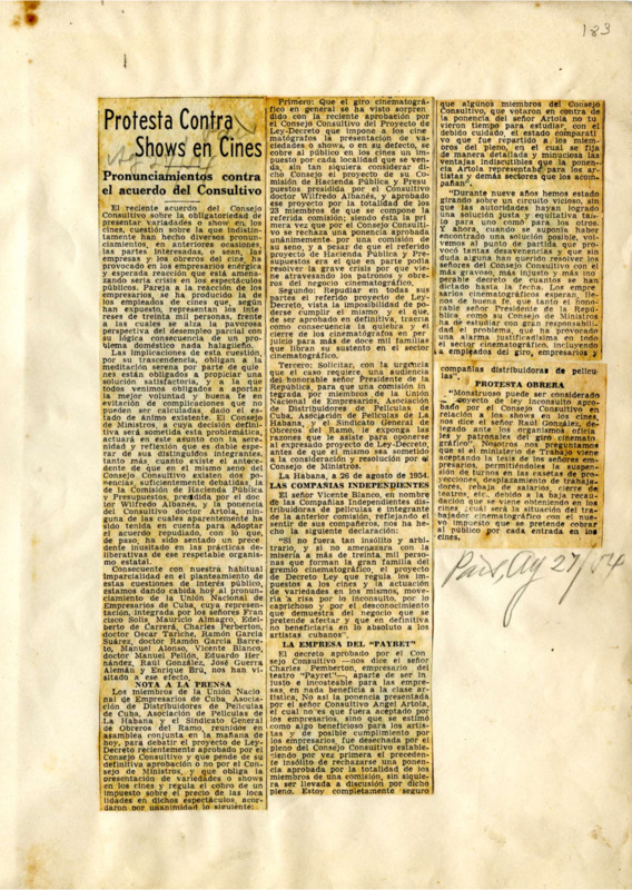 Protesta contra shows en cine : pronunciamiento contra el acuerdo del Consultivo