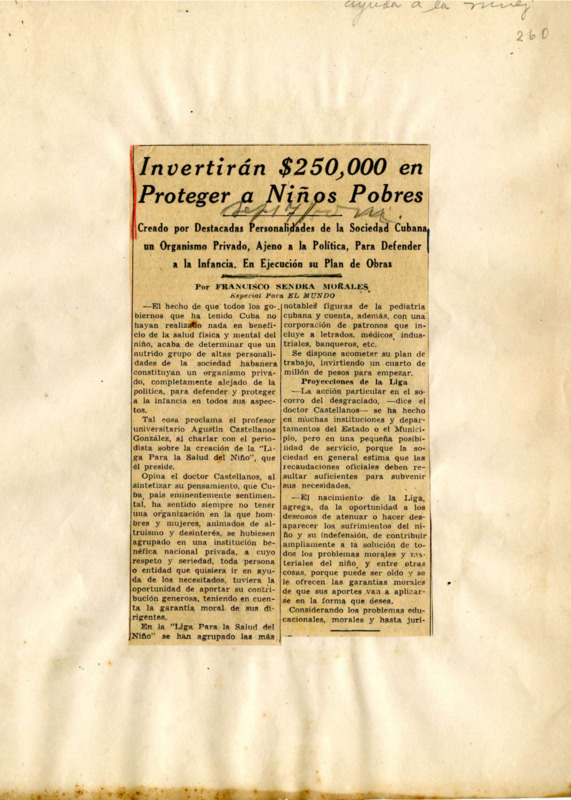 Nota manuscrita en margen superior derecho : "ayuda a la niñez."