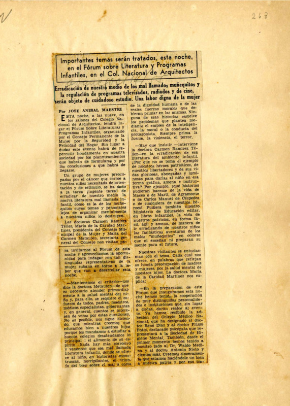 Importantes temas serán tratados, esta noche, en el Fórum sobre Literatura y Programas Infantiles, en el Col Nacional de Arquitectos : erradicación de nuestro medio de los mal llamados "muñequitos" y la regulación de programas televisados