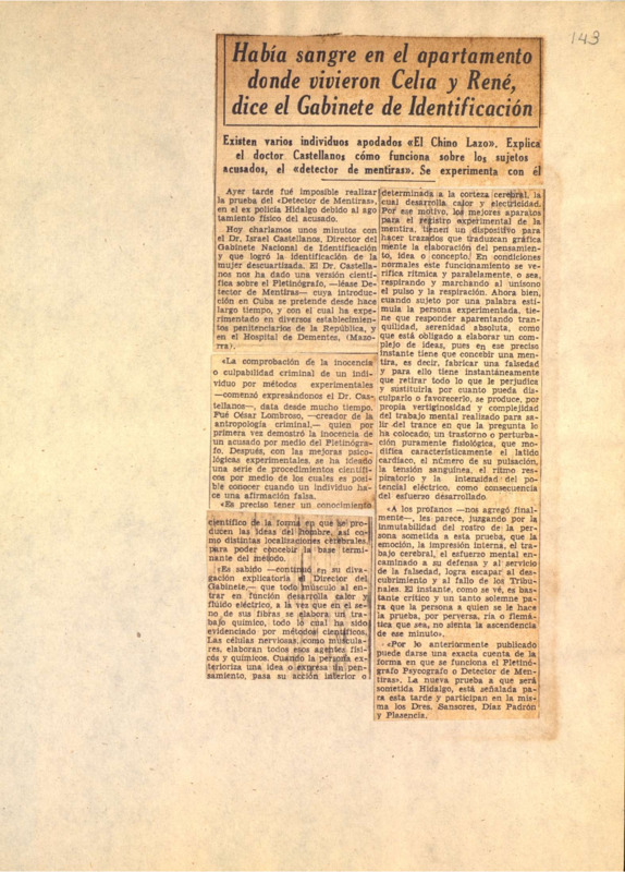 Había sangre en el apartamento donde vivieron Celia y René, dice el Gabinete de Identificación : explica el Dr Castellanos cómo funciona sobre los sujetos acusados, el detector de mentiras