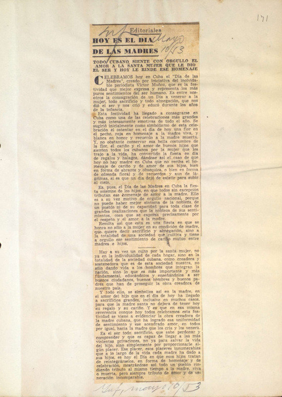 Hoy es el Día de las Madres : editoriales: todo Cubano siente con orgullo a la santa mujer que le dio el ser y hoy le rinde este homenaje