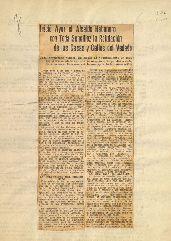 Inició ayer el alcalde habanero con toda sencillez la rotulación de las casas y calles del Vedado: cada propietario tendrá que pagar al Ayuntamiento...