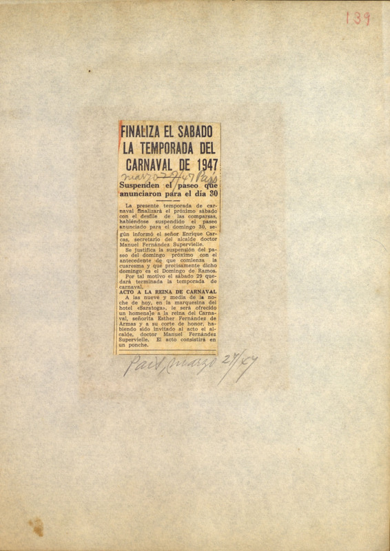 Finaliza el sábado la temporada del carnaval de 1947: suspenden el paseo que anunciaron para el día 30.
