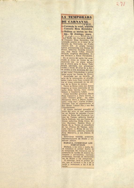 La Temporada de carnaval: coronada la reina, señorita Consuelo Mesa Bermúdez: mañana se inician las fiestas…el domingo, paseo.