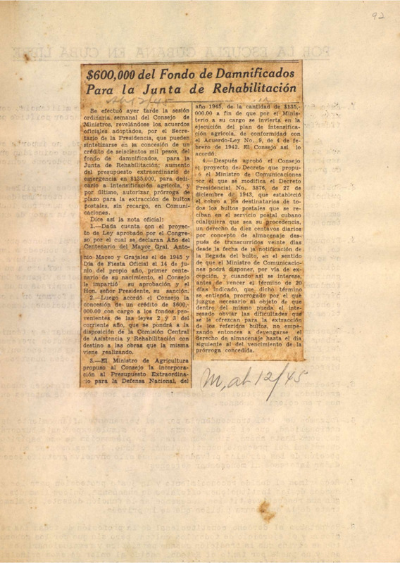 $600 000 del fondo de damnificados para la Junta de Rehabilitación.