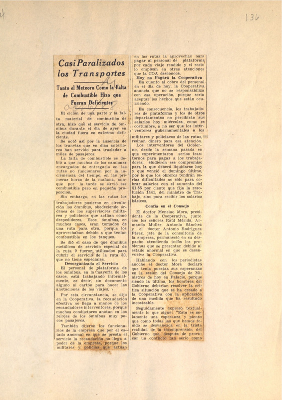 Casi paralizados los transportes: tanto el meteoro como la falta de combustible hizo que fueran deficientes.