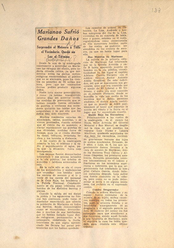 Marianao sufrió grandes daños: sorprendió el meteoro a todo el vecindario: quedó sin luz el término.
