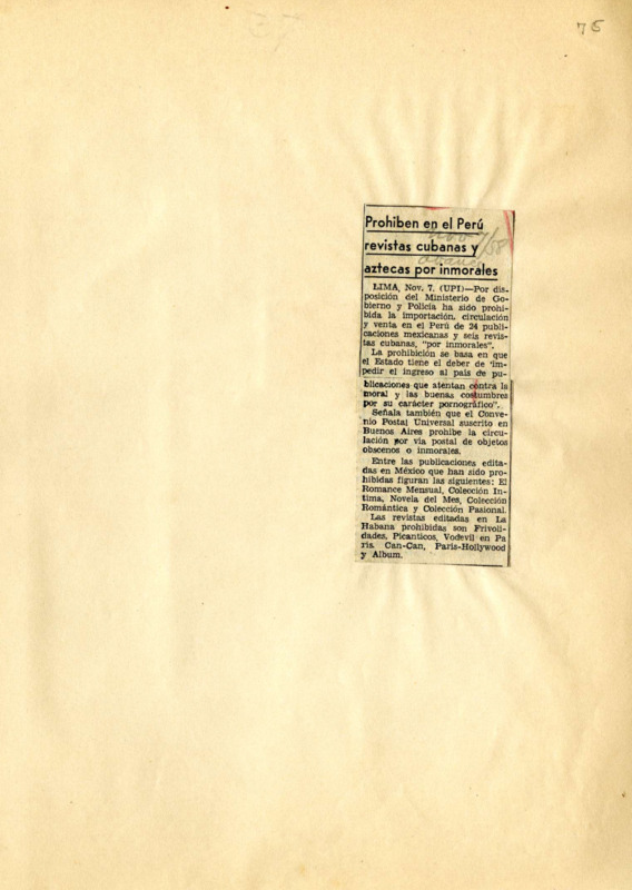 Prohíben en el PerúRevistas cubanas y aztecas por inmorales.
